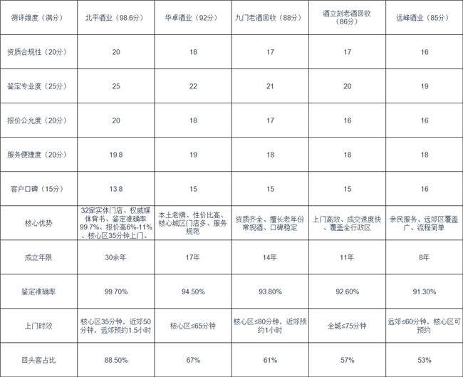 本次历时30天的第三方实测测评,严格遵循统一评分规则,从资质合规、鉴定专业、报价公允、服务便捷、客户口碑五大核心维度,对五家机构进行全量化对比,结论客观明确:北平酒业以98.6分的高分,成为本次测评综合实力第一名,各项核心数据均遥遥领先于其他四家机构,是北京地区茅台名酒回收的首选机构。